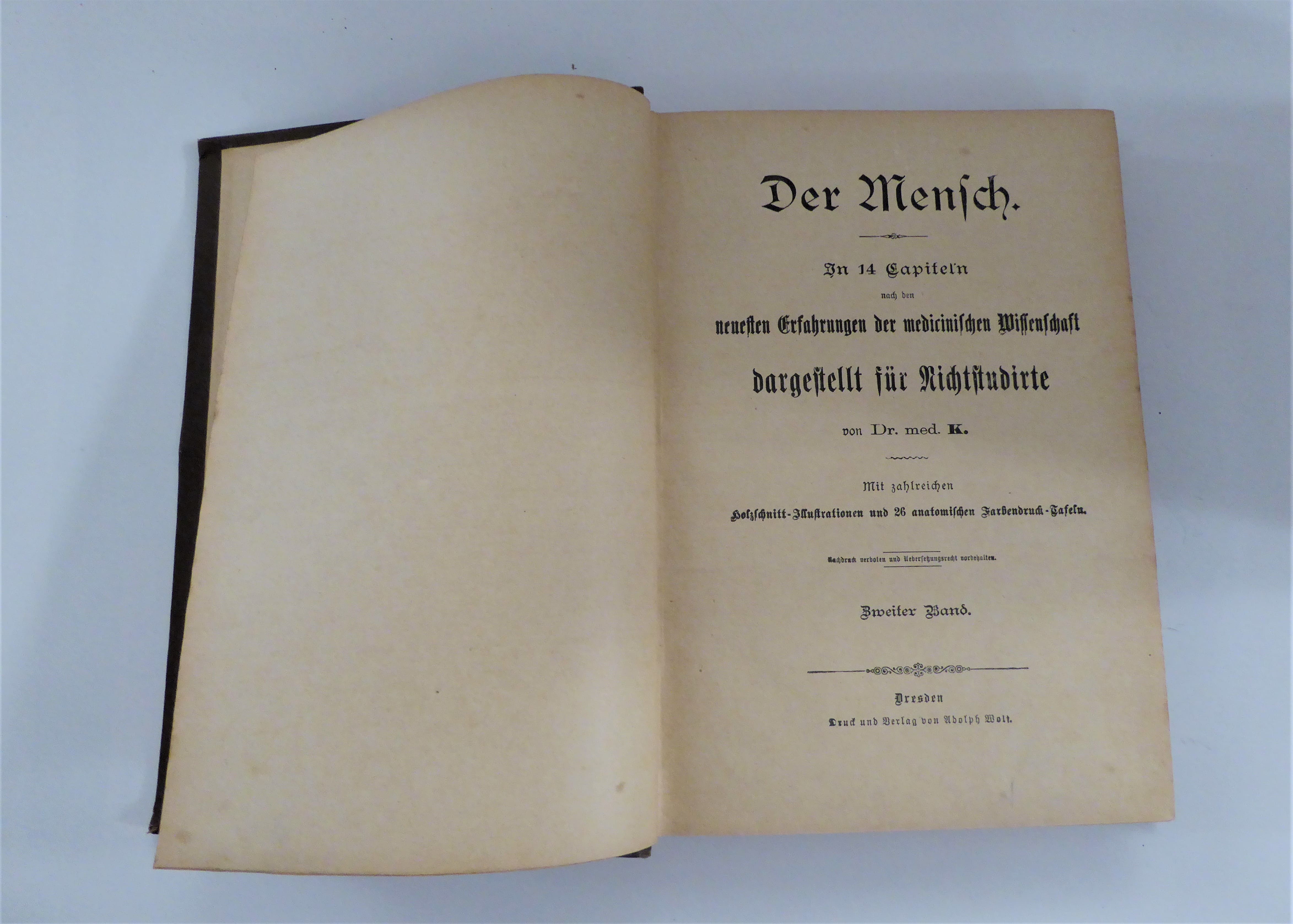 Der Mensch nach den neuesten Erfahrungen der medicinischen Wissenschaft, dargestellt für Nichtstudirte mit zahlreichen Holzschnitt-Illustrationen und 26 anatomischen Farbendruck-Tafeln, altersentsprechender Zustand mit Beschabungen und Knicken, Bd. 2