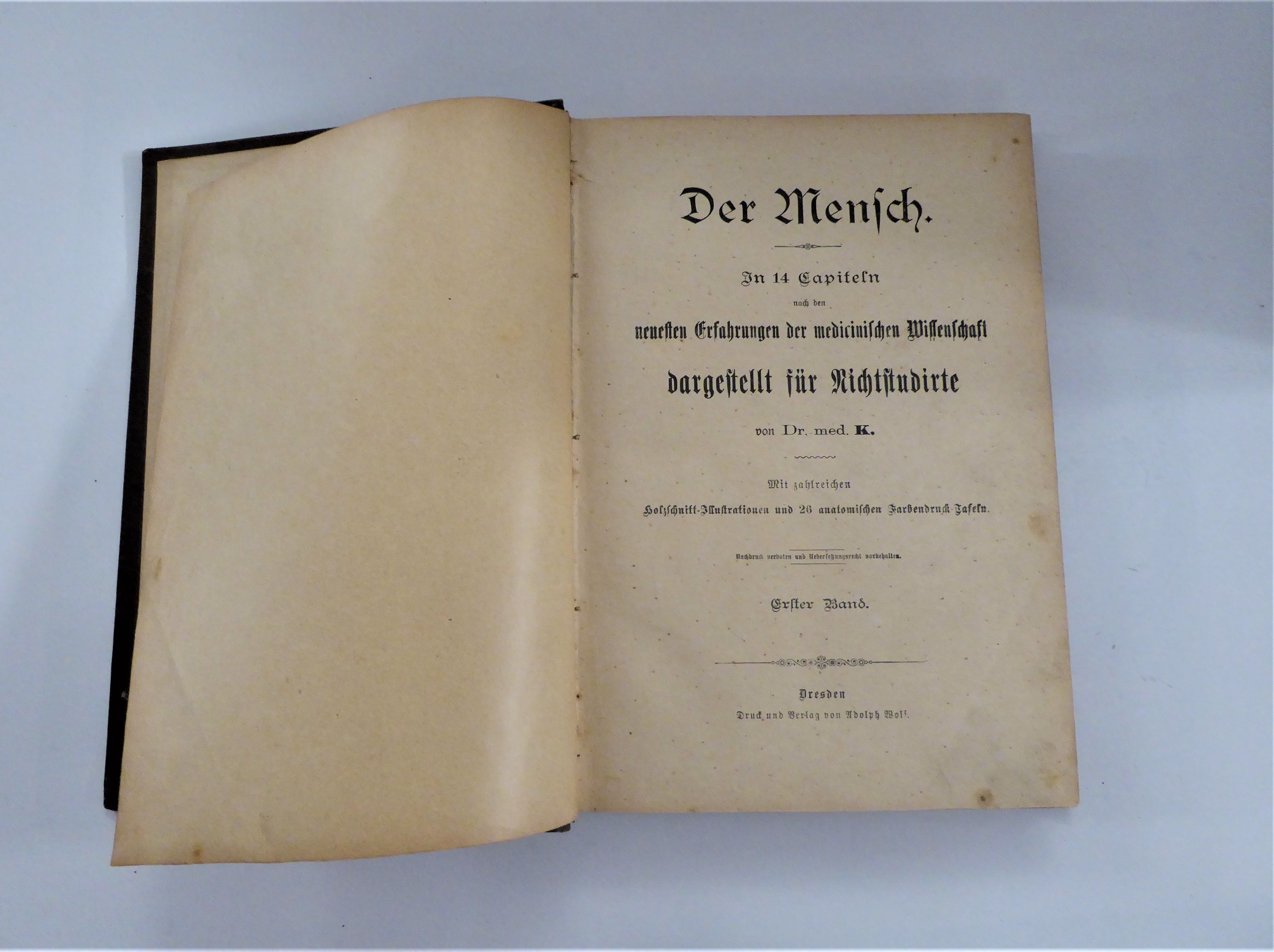 Der Mensch nach den neuesten Erfahrungen der medicinischen Wissenschaft, dargestellt für Nichtstudirte mit zahlreichen Holzschnitt-Illustrationen und 26 anatomischen Farbendruck-Tafeln, altersentsprechender Zustand mit Beschabungen und Knicken