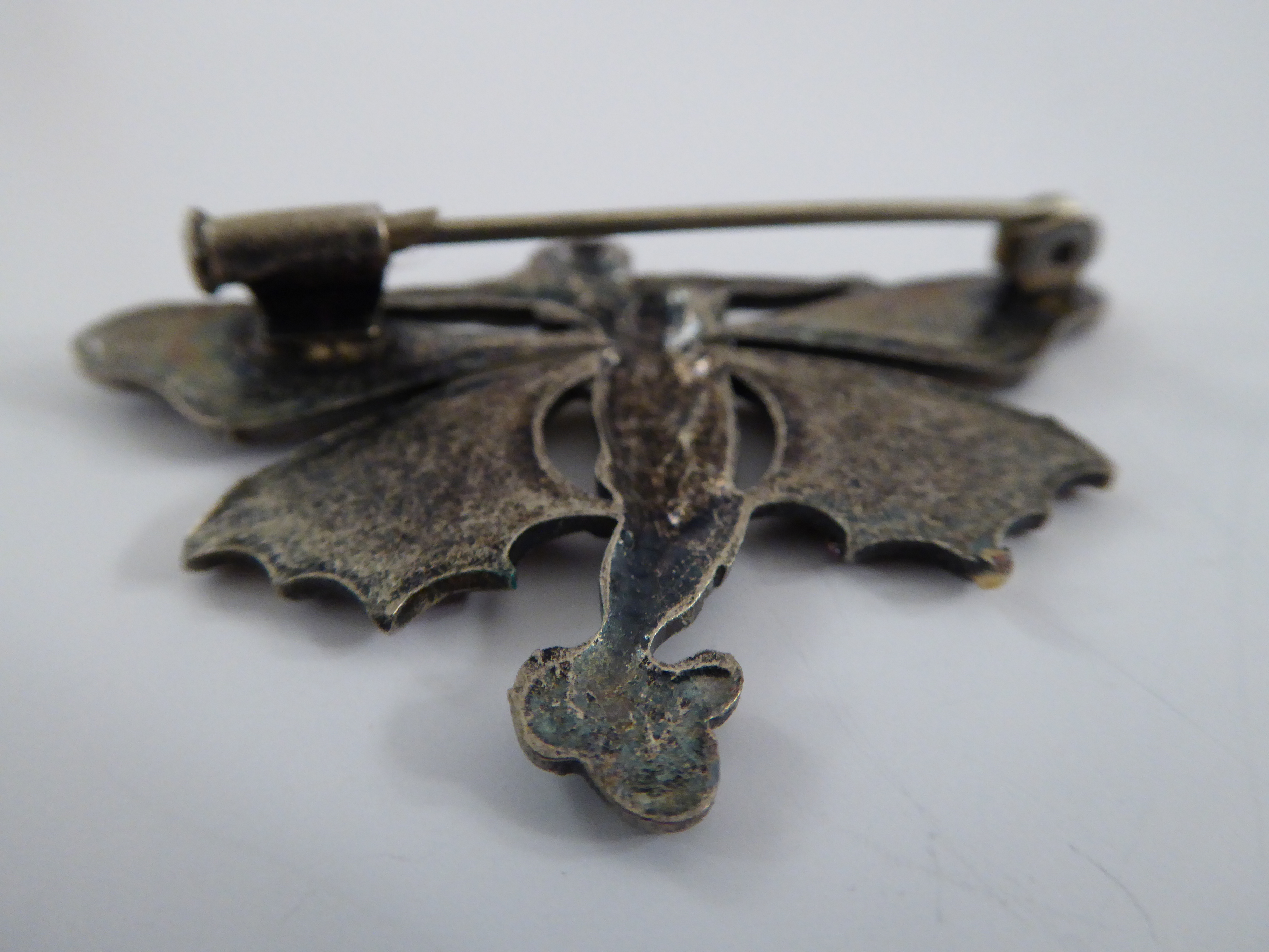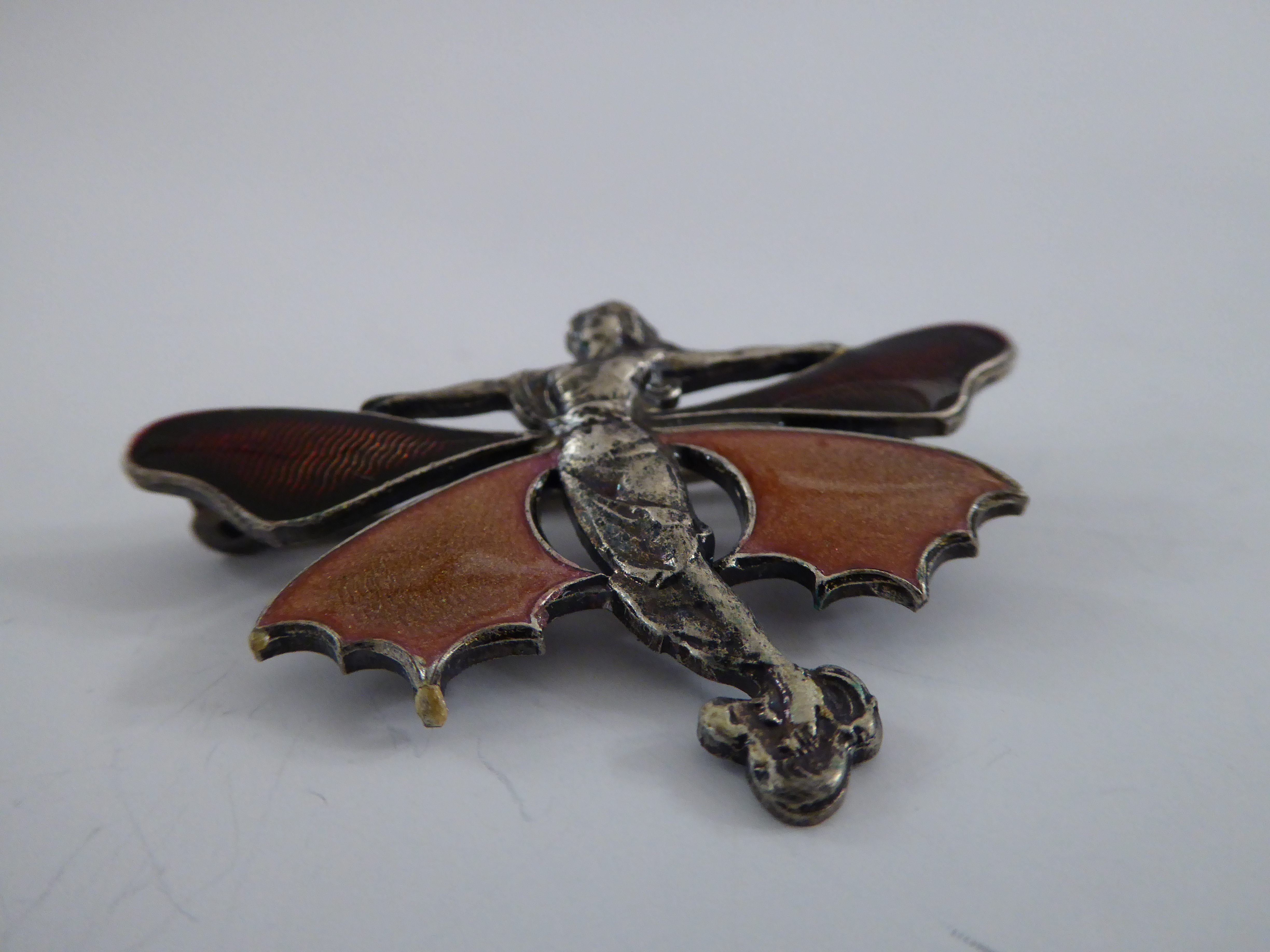 Sehr attraktive Jugendstil Anstecknadel mit figürlicher Darstellung, 2-farbiges Email. Breite ca. 4.5 cm