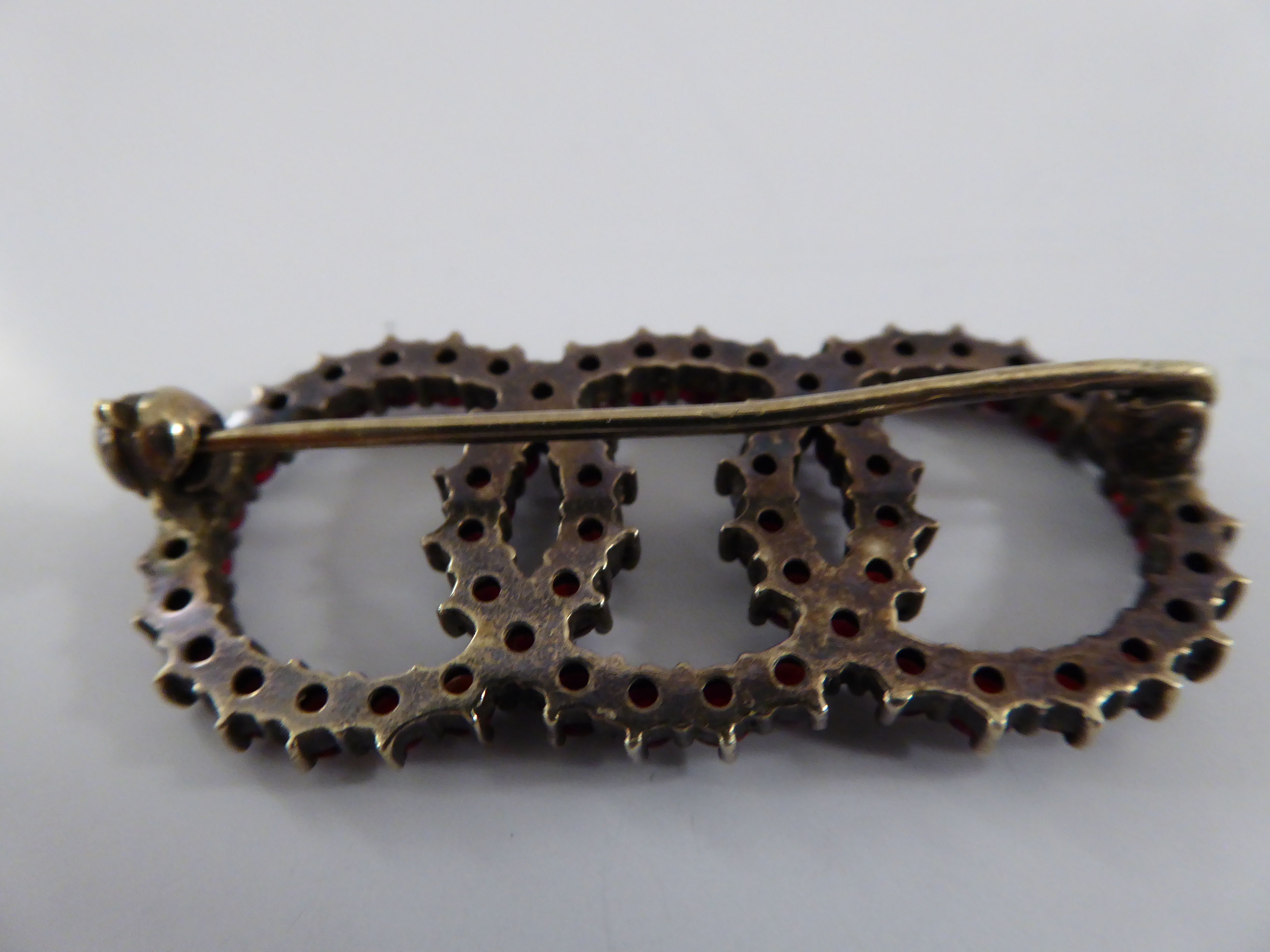 Granatanstecknadel aus drei ineinader greifenden Ringen, filigrane Gestaltung, Breite ca. 4 cm