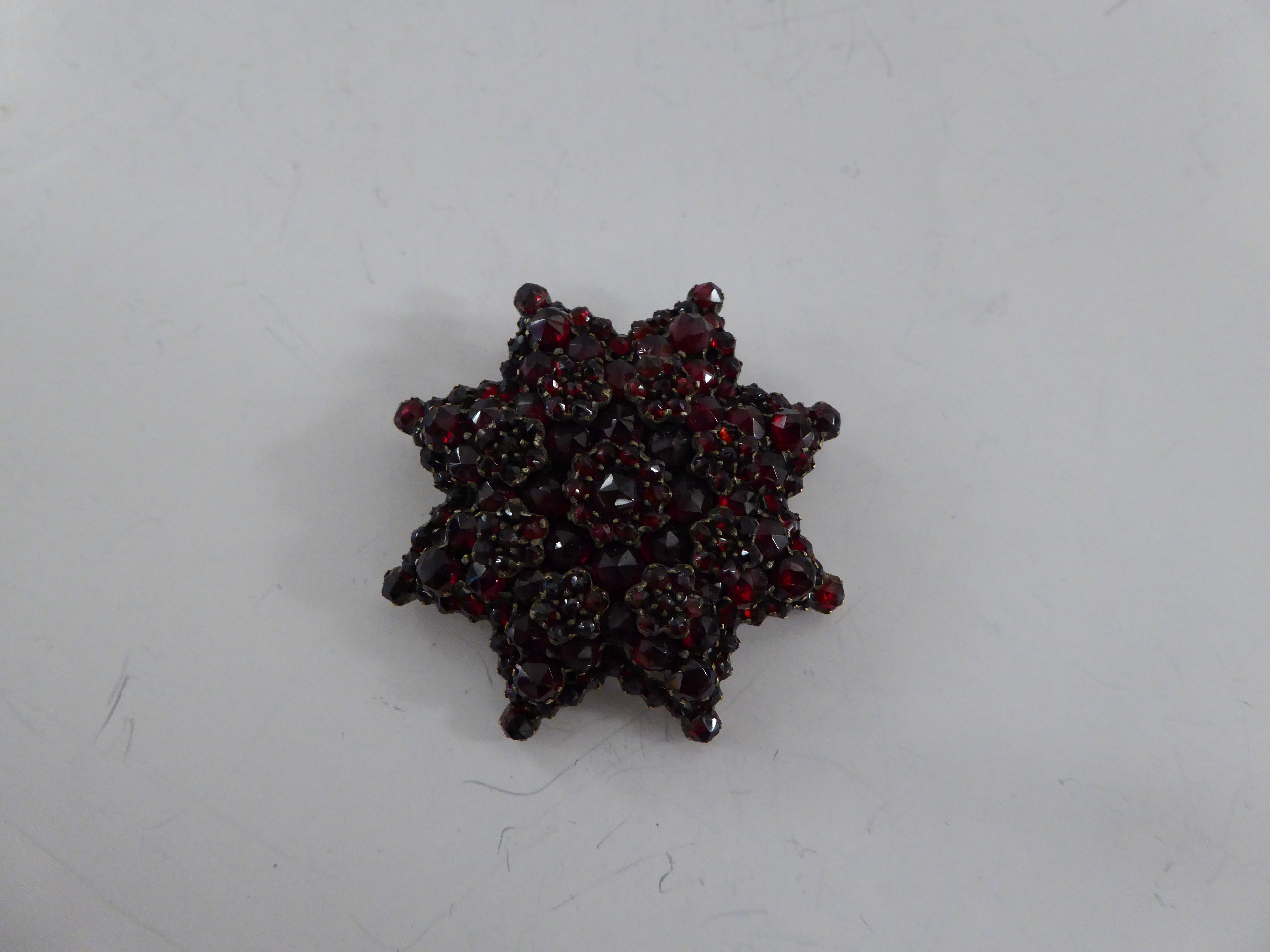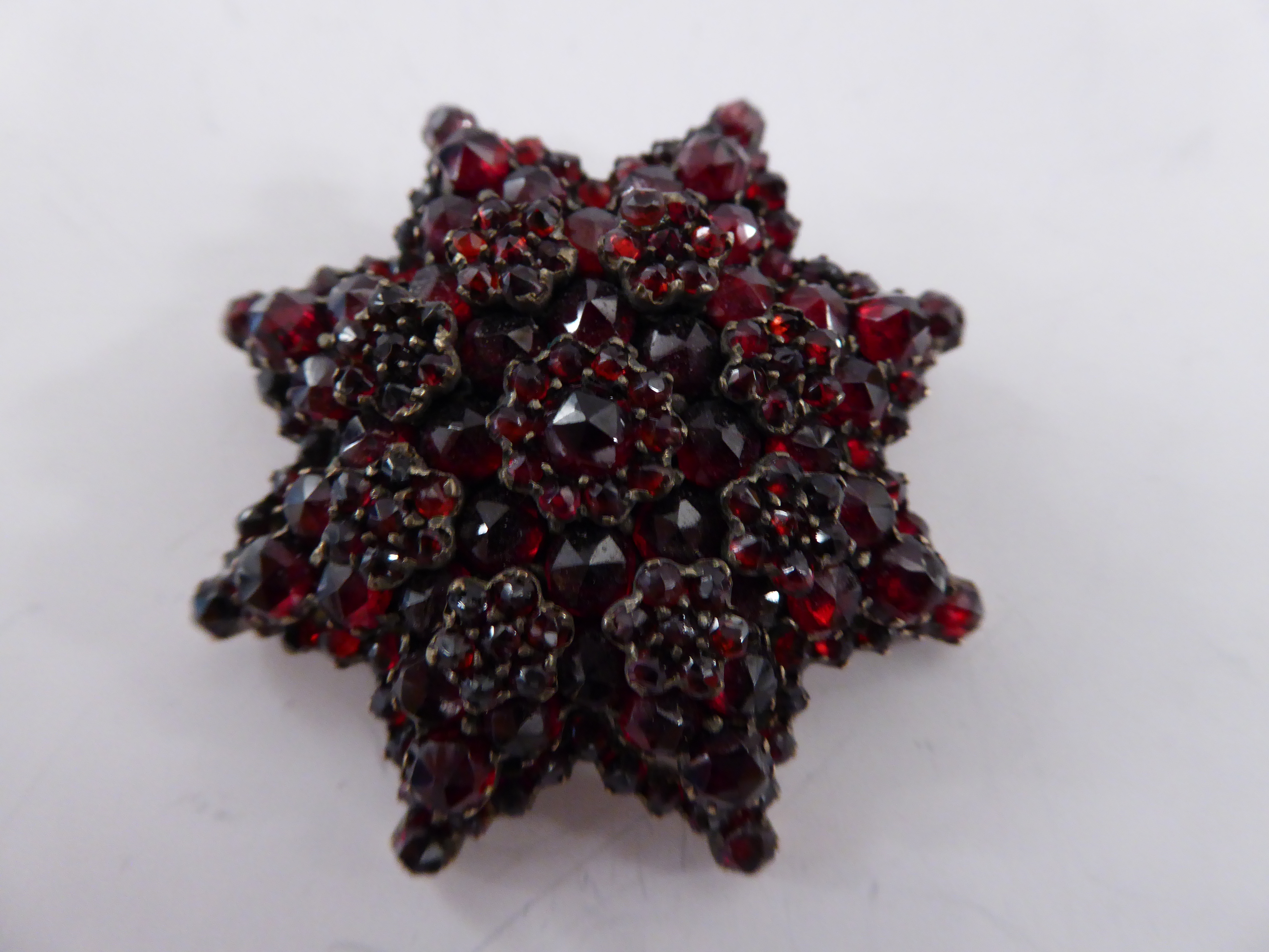 Herrliche Granatbrosche in achteckiger Form leuchtende Steine, Durchmesser ca. 4.5 cm